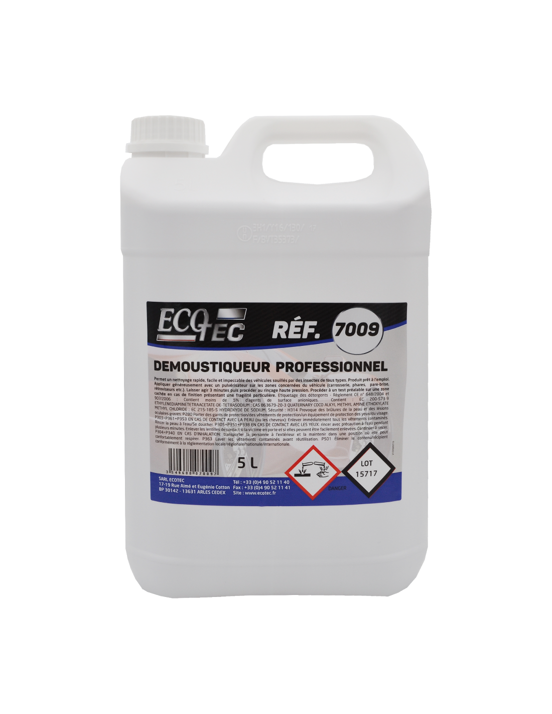 Aplique generosamente con un pulverizador las zonas concernidas del vehículo inclusive los retrovisores. Deje actuar 3 minutos y proceda a enjuagar con agua a alta presión. Realice una prueba en un lugar no visible antes de aplicar sobre alguna superficie con alguna fragilidad particular.