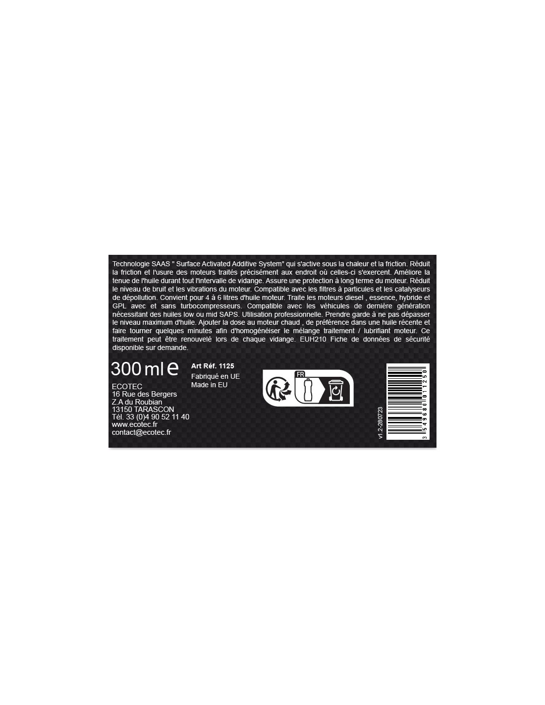 Conviene para ser usado en 4 a 6 litros de aceite. Puede tratar motores diésel, gasolina, híbridos y GLP con o sin turbocompresores. Compatible con vehículos de última generación que utilizan aceites low o mid SAPS. Prestar atención de no sobrepasar el nivel máximo de aceite. Agregar el contenido con el motor caliente, de preferencia en aceite reciente, y dejar trabajar algunos minutos con el fin de homogenizar la mezcla tratamiento / lubricante motor. Este tratamiento puede ser renovado a cada mantenimiento.