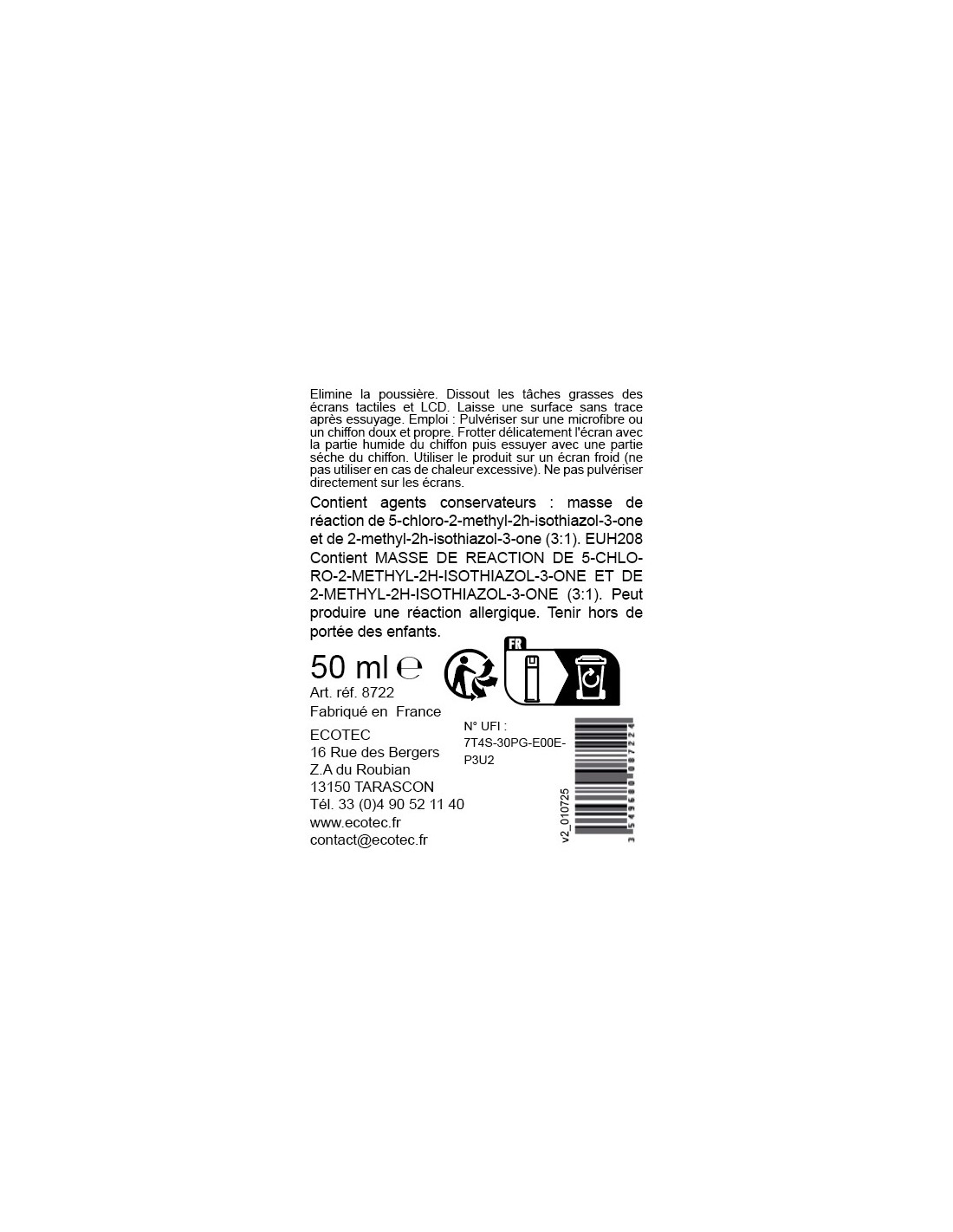 Pulvériser le Nettoyant Ecrans ECOTEC sur une micro fibre ou un chiffon doux et propre. Frotter délicatement l'écran avec la partie humide du chiffon puis essuyer avec une partie séche du chiffon. Utiliser le produit sur un écran froid (ne pas utiliser en cas de chaleur excessive). Ne pas pulvériser directement sur l’écran.