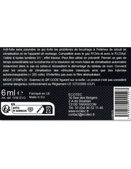 - Colmate de façon permanente les micro fuites des pièces caoutchouc et métalliques des circuits de climatisation.
