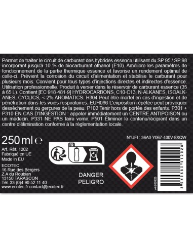 - Traite le circuit de carburant des hybrides essence utilisant du SP 95 / SP 98 incorporant jusqu'à 10 % de biocarburant éthanol (E10).
