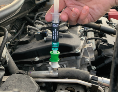 4. Connect the cartridge to the port through the gas adapter (Fig. B - gas R134a, Fig. C - gas R1234 yf). (2 adapters provided) and introduce the product into the system. If using a recharge machine, the injection can be performed after the vacuum process and before refilling.