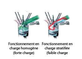 Dans le moteur essence à injection directe, l'injecteur est placé directement dans la chambre de combustion et il va injecter le carburant après son passage par l'admission. Cette disposition va permettre de se passer du papillon des gaz (et des pertes liées à sa présence), de gagner en rendement (taux de compression plus élevé) et surtout de travailler avec un rapport air / essence variable , quelquefois très pauvre. On va pouvoir constituer une zone avec un dosage normal air/ essence près de la bougie qui va enflammer une autre zone de mélange plus pauvre. On parle de charge stratifiée. Le gain en consommation de carburant est important notamment sous faible sollicitation du moteur. Sous forte sollicitation, on rétablira un fonctionnement proche de l'injection indirecte (charge homogène).