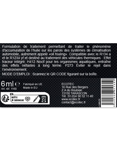 - Produit compatible avec le R134 a et le R 1234 yf et destiné au traitement des véhicules thermiques.