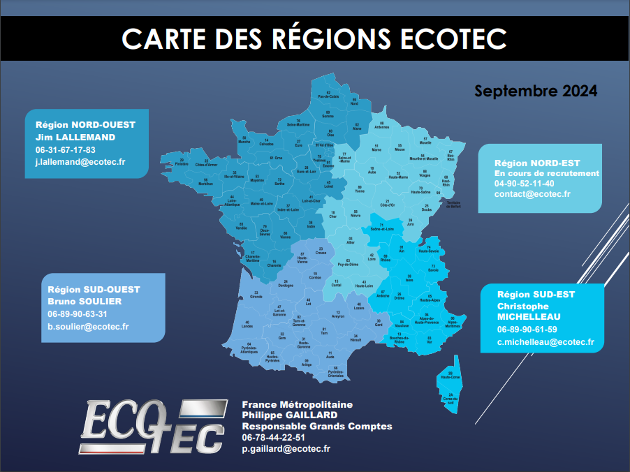 Notre réseau commercial est organisé par régions, qui couvrent la totalité du territoire métropolitain. Nos 30 technico-commerciaux, animateurs des ventes et directeurs de région assurent quotidiennement la vente, l'information, le conseil, l'assistance technique et commerciale ainsi que les démonstrations produits.